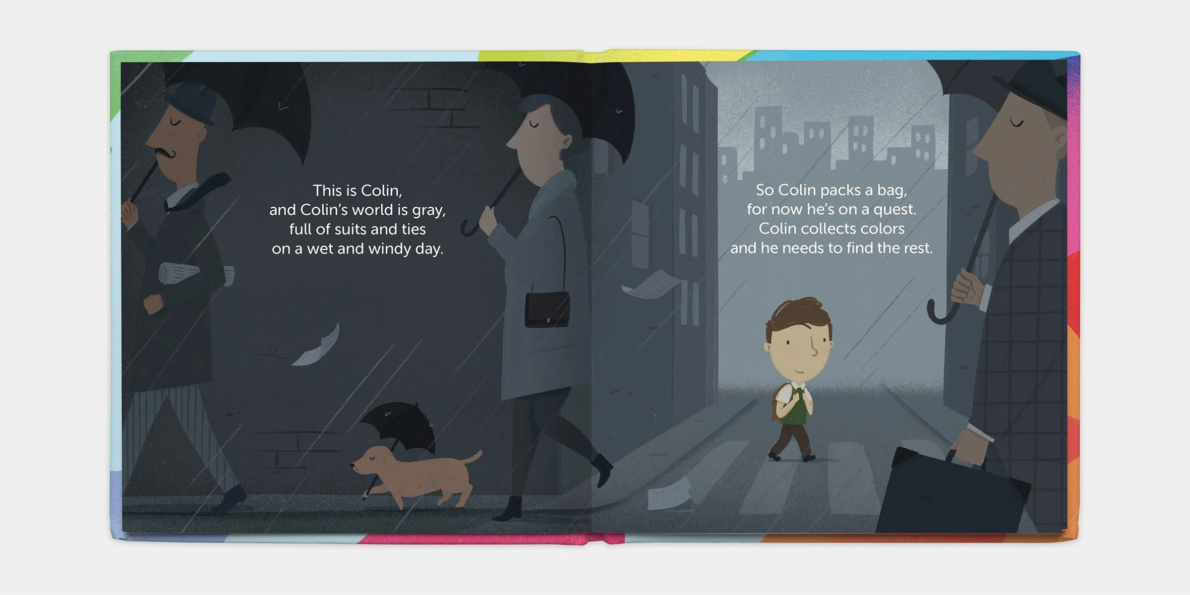 Colin's world is dull and grey, but he's on a special quest! He is off to collect colours from all over the world, from the white arctic to the indigo sea to the red outback. Join Colin as he finds all the colours he needs to brighten up his world.
